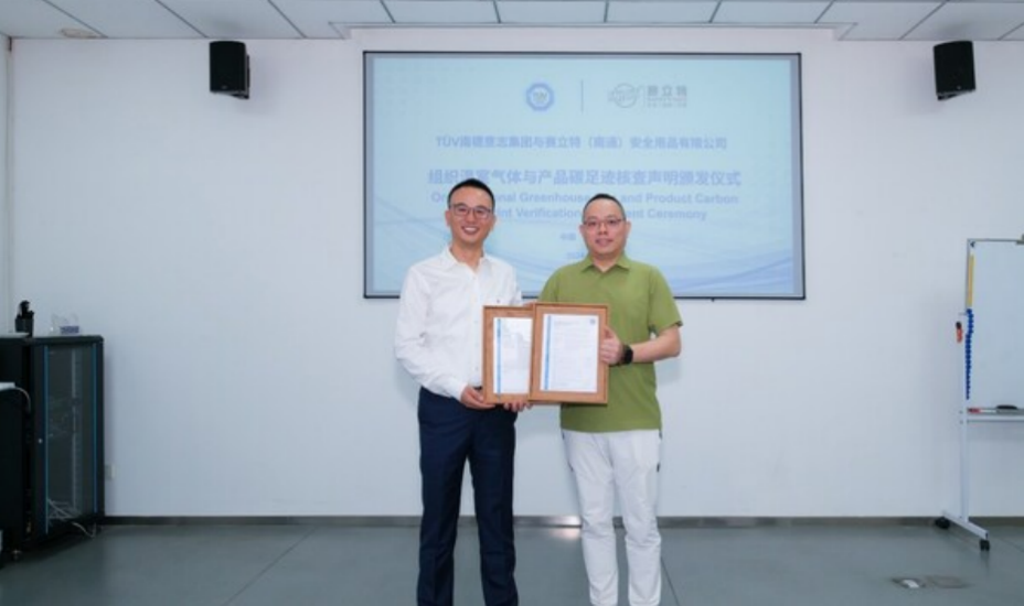 近日,TÜV南德意志集团(以下简称“TÜV南德”)为赛立特(南通)安全用品有限公司(以下简称“赛立特”)颁发组织温室气体核查声明与产品碳足迹核查声明。TÜV南德大中华区纺织品部总监杨军伟先生、赛立特董事长赵卫先生出席本次颁证仪式(图一)。上述两张声明的颁发凸显出赛立特对环境责任的承担,展示了其在推动可持续发展和减少全球碳排放方面的行业领导力,同时彰显了TÜV 南德以专业技术助力赛立特实现PPE行业节能减排的目标。