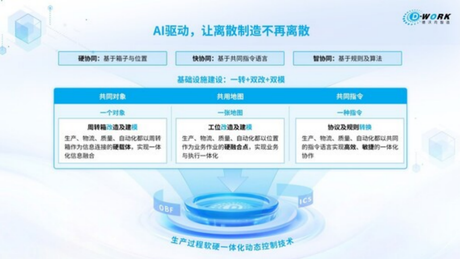 基于此,中之杰智能推出了德沃克OBF智能工厂解决方案。德沃克基于OBF单箱流自动追溯和ICS一体化智控技术,通过共同对象、共同地图、共同指令,帮助离散制造企业实现生产过程软硬件一体化的动态控制。凭借独特的技术路线和卓越的产品应用,德沃克OBF智能工厂,破解了离散制造现场"最后1米"的执行难题,帮助企业实现从原材料卸货到成品出库的全局柔性智能生产。