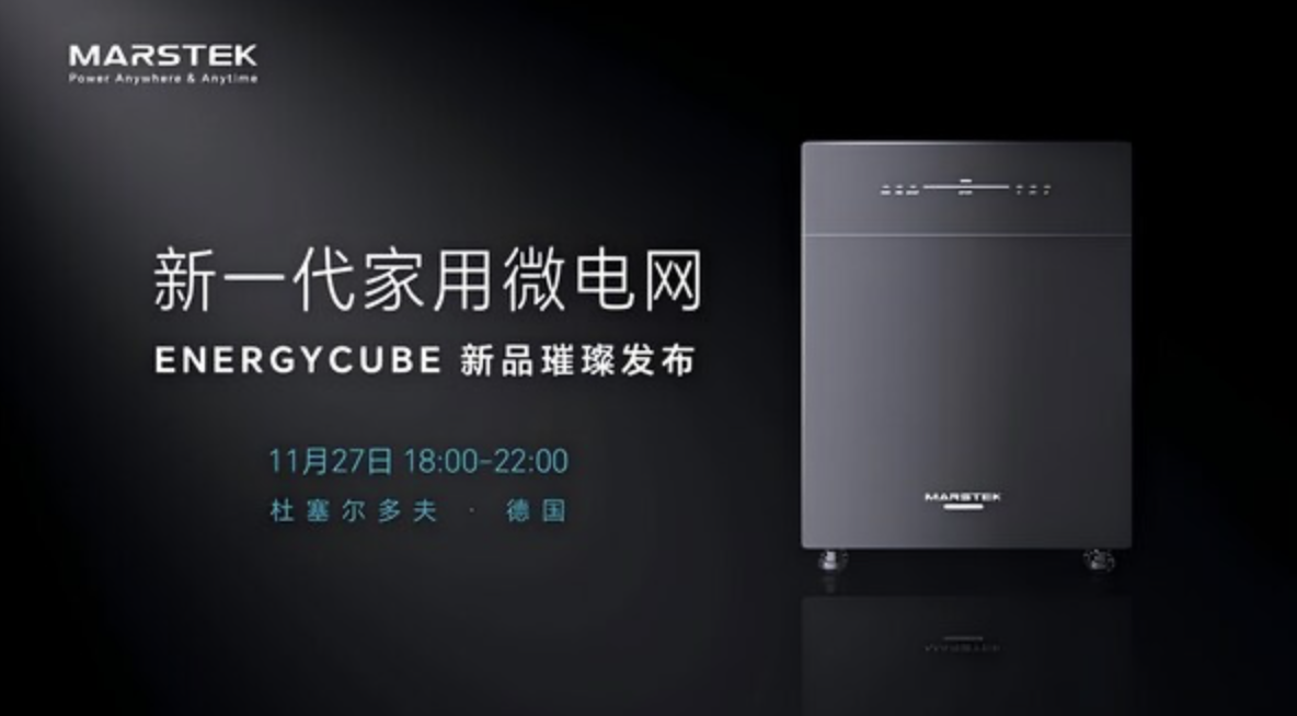 德国当地时间11月27日傍晚6点,MARSTEK储比特以“Next-Gen Home Microgrid”(“下一代家用微电网”)为主题的全球新品发布会在德国杜塞尔多夫隆重举办。此次发布会上,MARSTEK重磅推出旗舰产品“智能耦合微型储能系统ENERGYCUBE”及一系列阳台光伏储能新品。活动吸引了众多行业专家、渠道客户以及媒体代表,共同见证这一盛会。