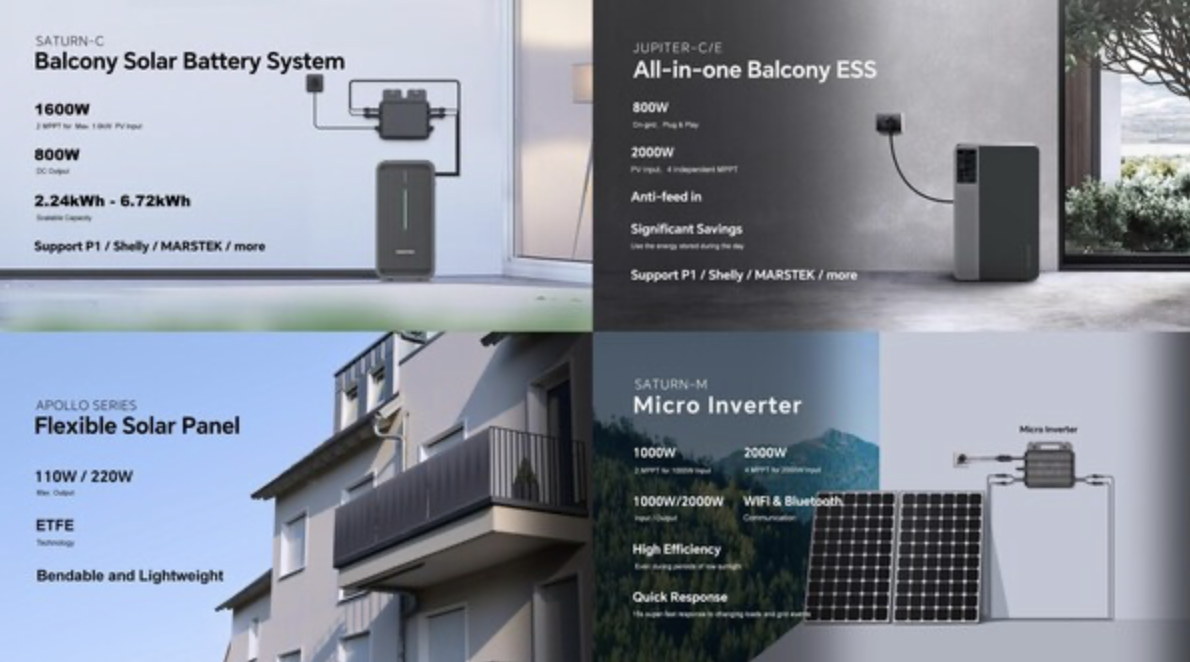 Marstek储比特推出一系列自主研发的阳台光伏一体机、微型逆变器和太阳能板产品,丰富其微型储能系统全面解决方案