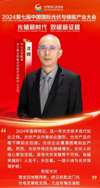 在2024第七届中国国际光伏与储能产业大会举办前期,沈辉教授以《乾挺光伏》为题,为光储行业澎湃发展题词:“潜龙田地敬拜乾,终日乾乾龙门先。光电至尊乾无限,亢龙有悔念谐乾。”寓意中国光储人如同太阳般熠熠生辉,不仅在技术上取得重大突破,为行业创新发展作出杰出贡献,更在推动全球绿色能源转型方面展现了非凡的智慧与领导力。