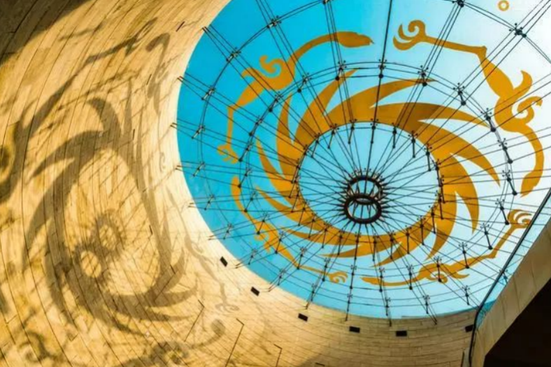 阳光透过成都金沙遗址博物馆陈列馆穹顶,在墙壁上投下太阳神鸟造型的影子。图片来源:新华社