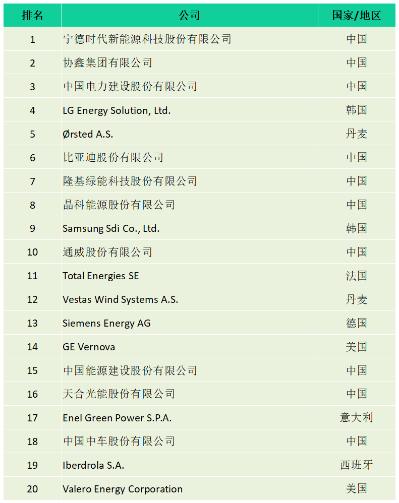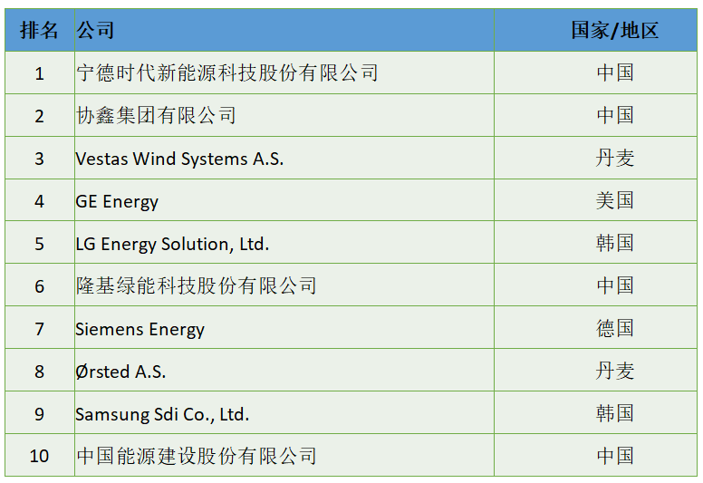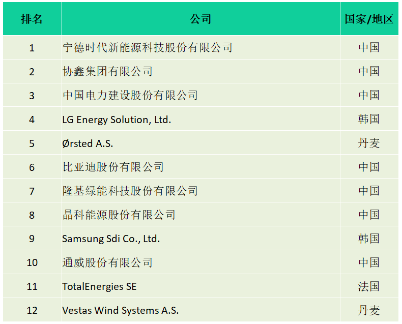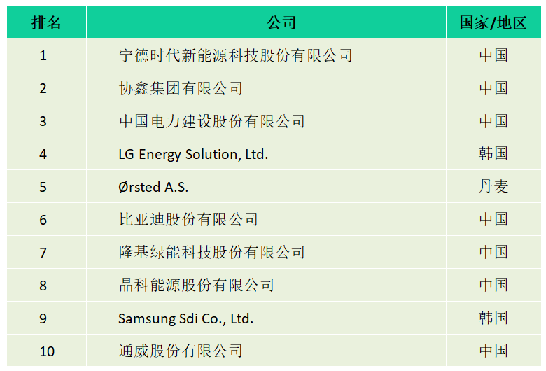 三是前十的企业中,亚洲有宁德时代、协鑫集团、中国电建、LG Energy Solution、比亚迪、隆基绿能、晶科能源、Samsung Sdi和通威股份等9家企业,欧洲只有Ørsted 1家企业(见表1)。与上年相比(见表2),亚洲企业增加3家,欧洲企业减少2家,美洲企业无缘前十。