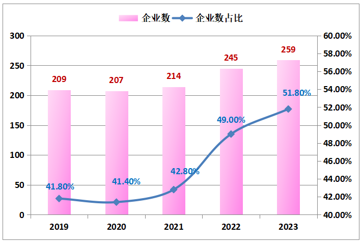 统计结果显示,2023年500强企业中,中国企业数达259家,比上年的245家增加14家,占比超过五成达51.80%,比上年的49%增加2.80个百分点(见图9)。