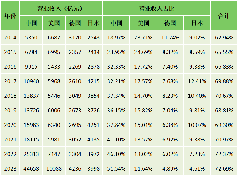 表3 2014-2023年“500强”企业中中美德日企业营收占比情况