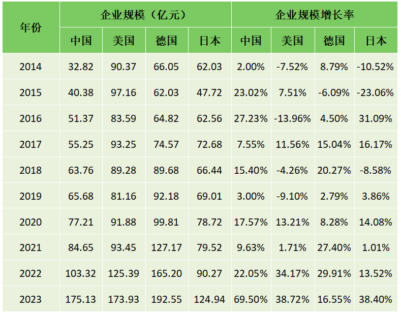二是企业规模上,2023年,中国、美国、德国和日本四国企业的平均规模均超过100亿元,分别为175.13亿元、173.93亿元、192.55亿元和124.94亿元,分别增长69.50%、38.72%、16.55%和38.40%,中国和美国增速占优(见表4)。