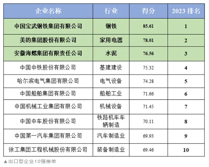 以受“碳关税”出口影响大、已经布局低碳技术及行业分布选取代表性出口型企业,从评价结果来看,中国宝武、美的集团及海螺集团表现亮眼。分析显示,10强出口型企业碳中和贡献力表现为:国有制造企业主动发力,带动行业“双碳”发展;绿色投资方向明确,深挖碳金融潜力;积极发布行动方案,统筹规划集团“双碳”未来;借力数字技术,信息化辅助企业低碳治理;生态协同发展不均,供应链减排有待提高。