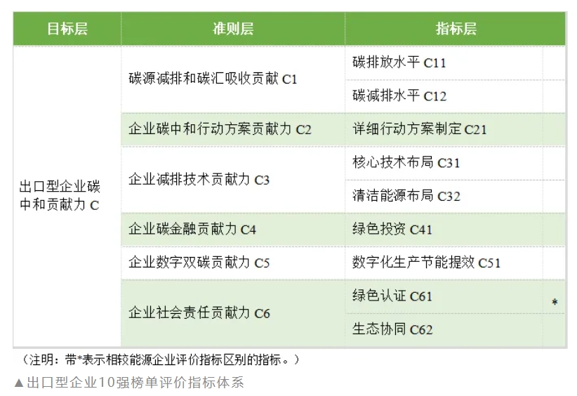 除能源企业以外,本次报告将出口型企业、上市公司两个特征性企业纳入量化评估对象,并建立两类企业的特征性贡献力评价模型,将其碳中和贡献力量化,在主榜单外推出出口型企业和上市公司特征性榜单。
