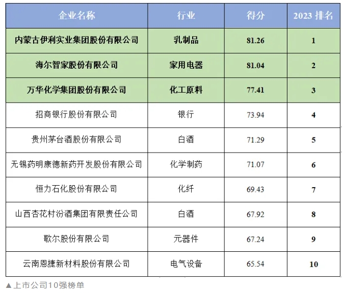 以财富、影响力及行业分布选取代表性上市公司。从评价结果来看,伊利集团、海尔智家及万华化学表现亮眼。分析显示,10强上市公司碳中和贡献力表现为:积极践行节能减排,助力国家“双碳”目标;绿色投资表现强劲,落实“双碳”目标深耕绿色金融;标杆企业带头制定行动方案,企业“双碳”规划仍需加强;国家和行业碳披露要求持续加强,企业披露工作仍需努力。