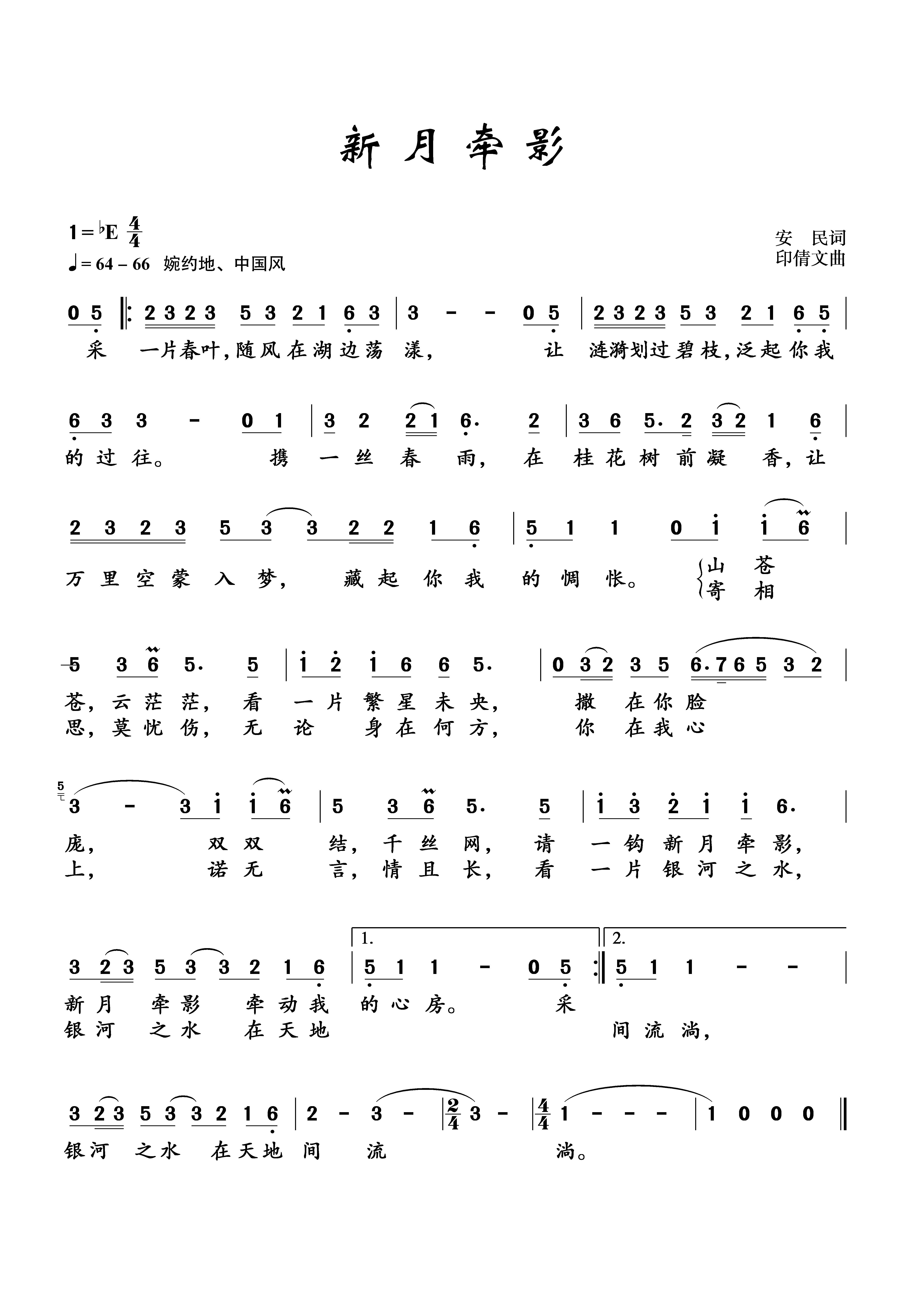 这首由安民作词、印倩文作曲、杨西音子演唱的《新月牵影》,勾出多少“悠悠天宇旷,切切故乡情”的思绪——浓浓的亲情、友情和爱情,深深的祖国之情、土地之情。