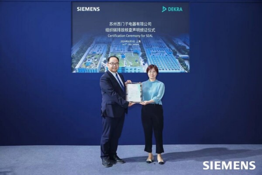 DEKRA德凯管理体系与可持续发展审核总经理韦斌生先生为苏州西门子电器有限公司颁发了"2023年度组织碳排放核查声明"证书。