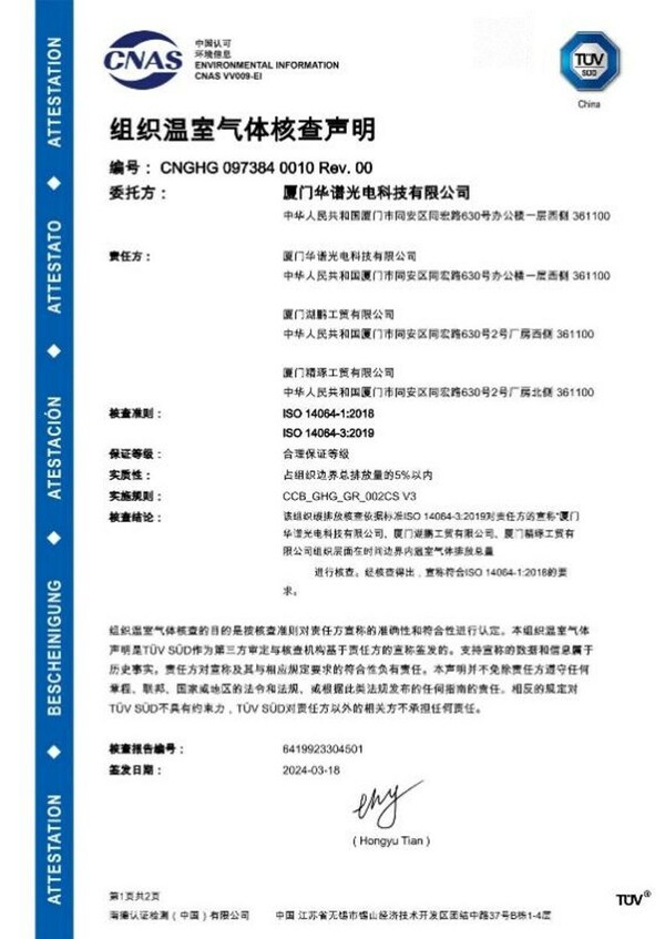 在“双碳”战略、绿色发展等国家战略牵引下,华谱光电积极向绿色低碳转型。在此次合作过程中,华谱光电邀请在可持续发展领域有资深经验的国际第三方认证检测机构TÜV南德为华谱光电以及下属2家工厂进行了组织碳排放核查。TÜV南德依据ISO 14064-1:2018标准核实华谱光电在2023年各排放源的温室气体排放等情况,最终证实华谱光电符合国际标准要求,并顺利签发了其首张带CNAS认可标志的ISO 14064-1:2018 组织碳排放核查声明。