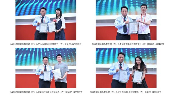 SGS向TCL、美的空调、派能科技、欣旺达代表分别颁发碳认证证书