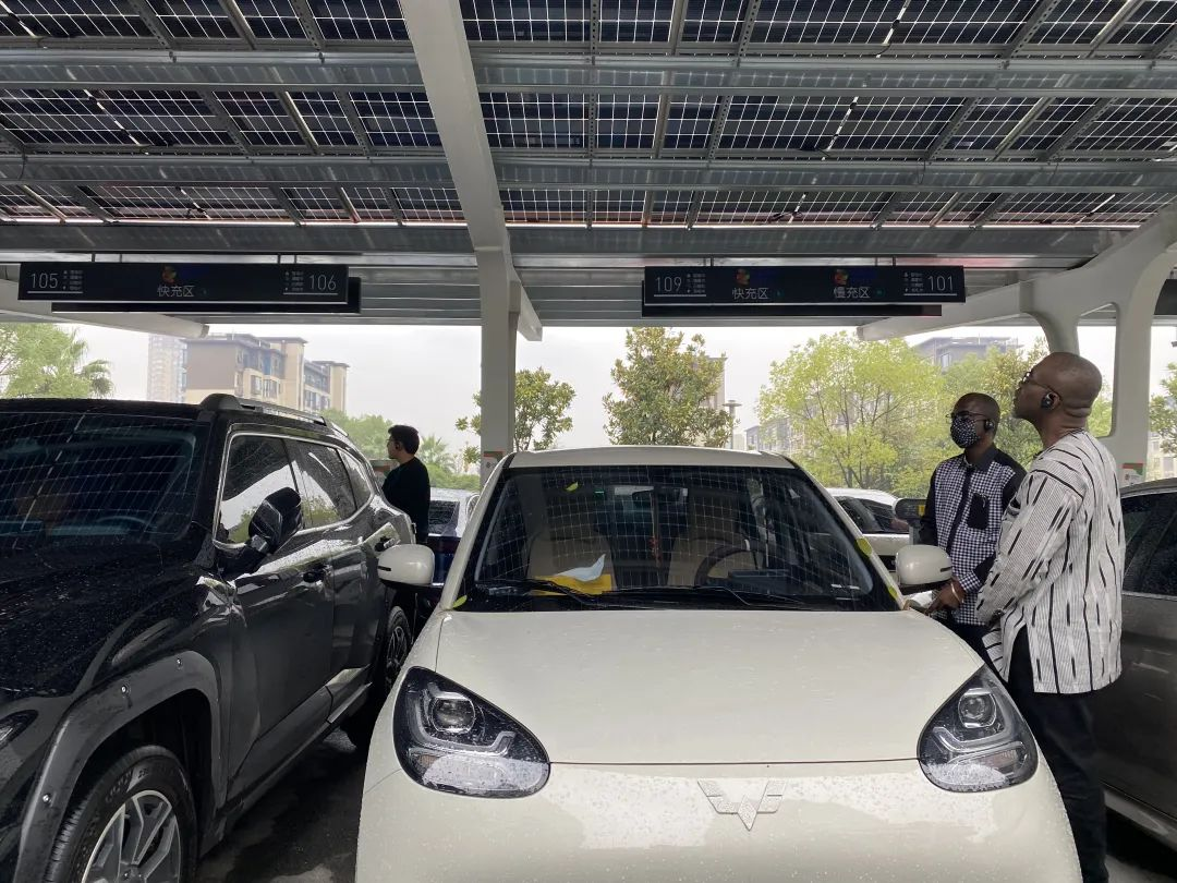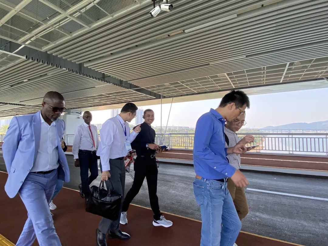 很快就要集合前往下一站——华为。易卜拉欣·马利克跟好几位记者一起,抓紧时机向建设者们了解更多的清洁能源情况。阳光照在他们身上,非常明亮。