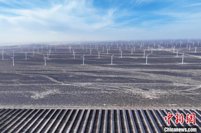 1月6日,航拍甘肃省酒泉市瓜州县光伏和风力发电项目。近日,甘肃瓜州皓达风电有限公司8万千瓦新风机试验场项目、瓜州昊华新能源电力有限公司20万千瓦光伏发电项目、寰泰(瓜州)风电有限公司瓜州北大桥白杨10万千瓦风力发电项目接入宝旭330千伏升压站成功并网,标志着瓜州承接的酒泉市“十四五”第二批新能源项目全部并网投运,预计“十四五”末瓜州电力装机将突破2000万千瓦大关。(无人机照片)中新社记者 李亚龙 摄