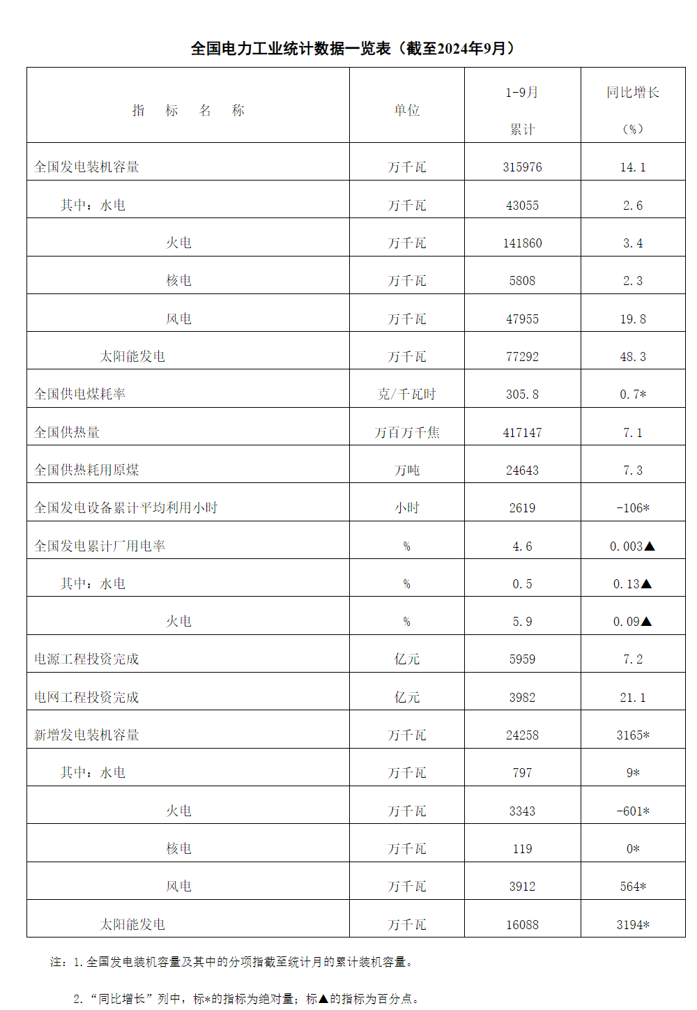 截至9月底,全国累计发电装机容量约31.6亿千瓦,同比增长14.1%。其中,太阳能发电装机容量约7.7亿千瓦,同比增长48.3%;风电装机容量约4.8亿千瓦,同比增长19.8%。