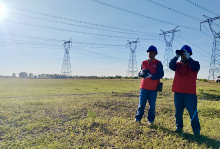 10月5日,蒙东兴安供电公司输电工区工作人员在500千伏核红线进行特殊巡视,排查线路通道内火灾隐患。(孟禹 摄)