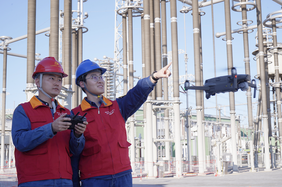 9月23日,±800千伏扎鲁特换流站检修现场,工作人员使用无人机对高处作业进行远程督查。(摄影:张冲)