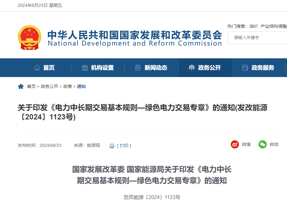 国家发展改革委 国家能源局关于印发《电力中长期交易基本规则—绿色电力交易专章》的通知