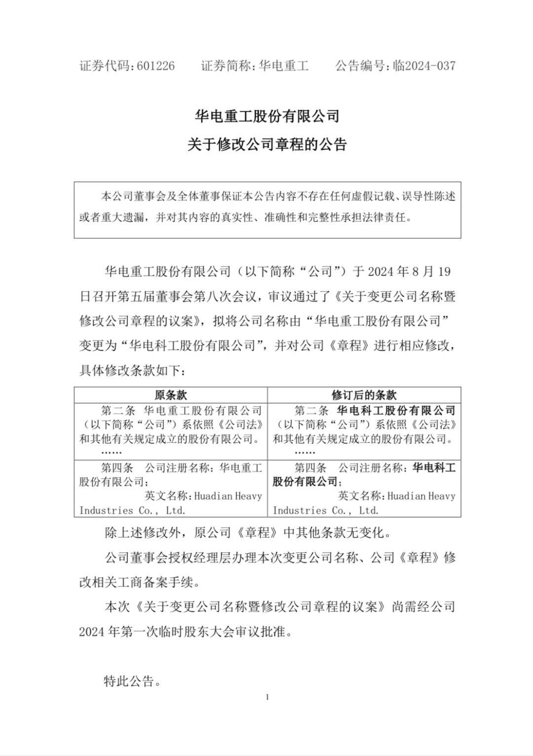8月20日,华电重工发布公告称,公司于2024年8月19日召开第五届董事会第八次会议,以9票同意、0票反对、0票弃权的结果,审议通过了《关于变更公司名称暨修改公司章程的议案》, 拟将公司中文全称由“华电重工股份有限公司”变更为“华电科工股 份有限公司”,英文全称保持不变。