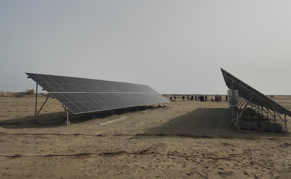 在塔克拉玛干沙漠北缘的新疆阿克苏地区沙雅县,一家光伏企业正尝试利用光伏发电取水,这样既能清洁光伏板,又能抚育耐碱、耐旱的沙生植物。