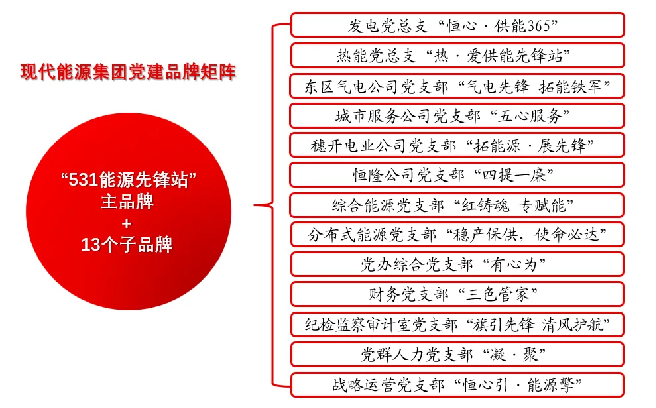 创建践行党建品牌,让国企党建焕发充满活力的生命力。现代能源集团党委不断创新国有能源企业党建、业务融合路径,以创建“五强五化”示范党组织为契机,精心创建“531能源先锋站”特色党建品牌,织密上下贯通、执行有力的国企基层党组织体系,将党建“软实力”转化为推动高质量发展的“硬支撑”。同步发挥党建品牌“强基、聚力、头雁、对标、激励”五大作用,使党建品牌效能全面融入到经营发展管理全过程、各环节,并持续转化为企业发展的生产力。在“531能源先锋站”党建品牌引领下,几年来集团积极履行“保发电、保民生”的社会责任,坚持“有呼必应”,全力保障区域电力热力稳定供应;结合主业为区域内企业量身定制优质的能源综合服务方案,连续十六年被广东省环保厅评为“环境诚信企业”。集团下属各党支部围绕“531能源先锋站”主品牌和各自中心工作,打造一支部一品牌一亮点,构建党建品牌矩阵,持续扩大党建品牌的影响力、传播力与美誉度,努力构建党建品牌“纵向贯通、横向连通、全向融通”的良好格局。