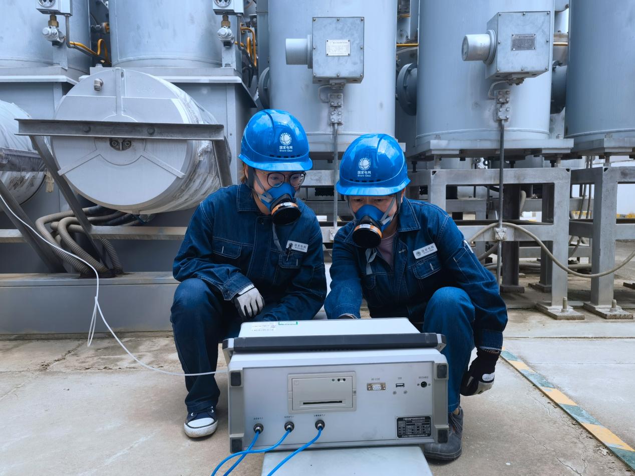 7月16日,在该厂户外330千伏开关站内,两名工作人员佩戴着防毒面具守护在检测设备旁边,她们正聚精会神,在炎炎烈日下精心操作着检测设备。