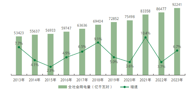 2023年我国全社会用电量达到9.2万亿千瓦时,同比增长6.7%。自2013年以来,电力需求稳步增长,全社会用电量增加3.88万亿千瓦时,十年平均增速约5.6%。用电结构继续优化,第三产业用电量年均增速10.3%,用电比重提高了6.4个百分点;居民生活用电年均增速7.1%,用电比重提高约2个百分点。