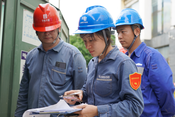 工作时,何佩佩一直背着一只拉不上拉链的工具包,里面装满了各种表单和一个漏出半截的粉红色水杯,手上拿着一张略显破烂的单线图纸。与其他文件褶皱程度完全不同,而这张褶皱的图纸正是她这几天坚守现场、冲锋在前的印记。当旁边的人问起她为什么不重新换张图纸,她说:“经贸大厦配变抢修工作十分复杂,前一天故障排查搞到凌晨才回去,然后一直在协调打电话,没时间打印。”她边说边抚平图纸,“不过这里的线路我都熟,不影响。”