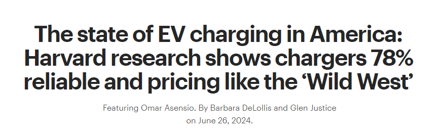 当地时间周三(6月26日),哈佛商学院研究员奥马尔·阿森西奥(Omar Asensio)发布了一项学术研究,称美国电动汽车车主使用公共充电桩成功充电的概率不到五分之四。