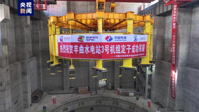6月25日上午10时58分,位于青海省海南藏族自治州境内、黄河上游的羊曲水电站3号机组定子顺利完成吊装。