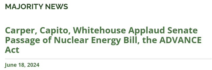 共和党参议员卡皮托(Shelley Moore Capito)称,“今天,我们将《ADVANCE法案》送到了总统的办公桌前,国会认识到核能对美国未来的重要性,并完成了这项工作。”
