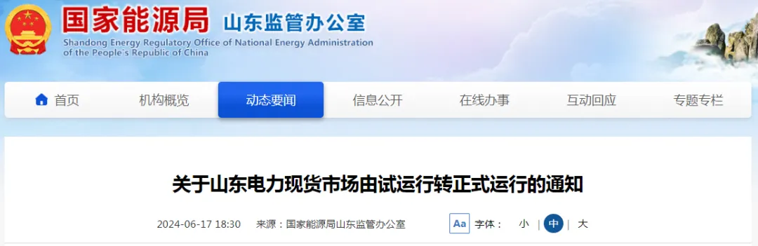 6月17日,国家能源局山东监管办公室发布《关于山东电力现货市场由试运行转正式运行的通知》(以下简称《通知》)。这是继山西、广东之后,又一电力现货市场进入正式运行阶段。