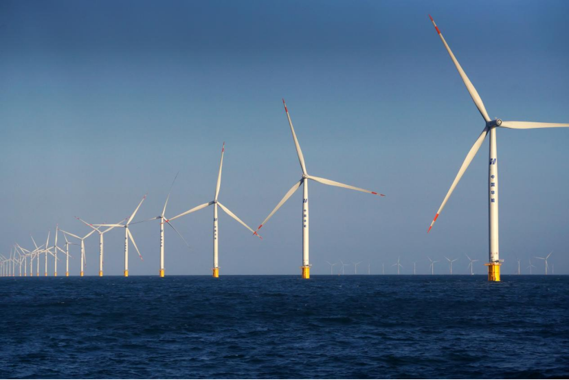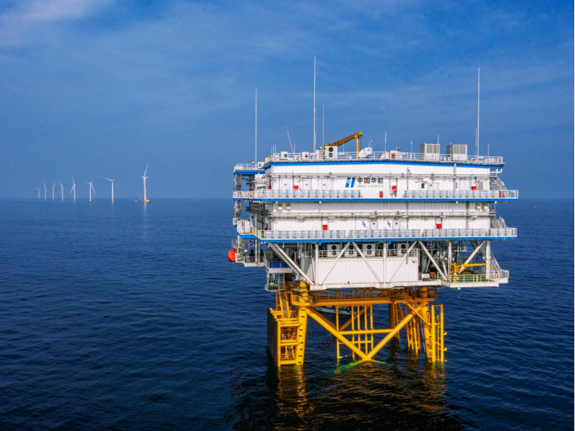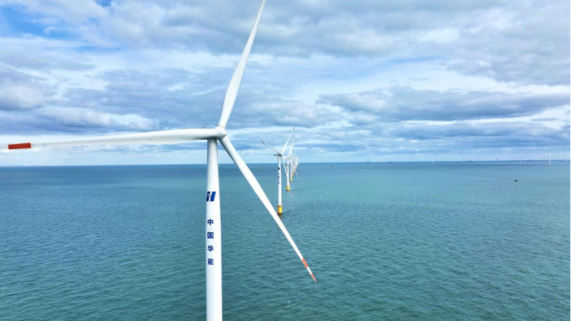 三月中旬,黄海之滨,海风凛冽。从山东海阳港码头出发,海上航行两个半小时后,就看见在蔚蓝辽阔的海天之间,一台台百米高的白色“大风车”列阵迎风旋舞,不远处,白蓝相间印有华能标识的海上升压站分外吸睛。