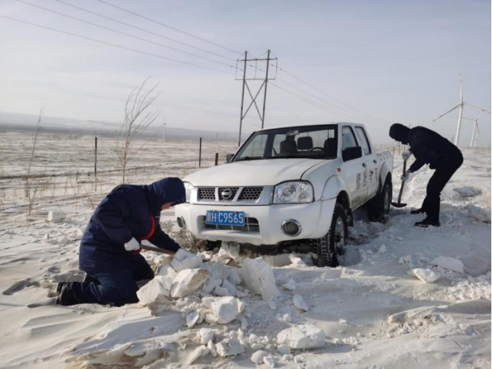 由于道路积雪严重,检修车辆被深深陷入积雪中,布尔津风电场负责人赵常兴组织人员及机械车辆开展破冰除雪行动,运维员们徒手挖雪推车,当车辆再也无法前行,他们就扛着工具包、拖拽着几十斤的备件,在凛冽的寒风之中徒步前行走向风机设备,为风电场的稳定运行保驾护航。