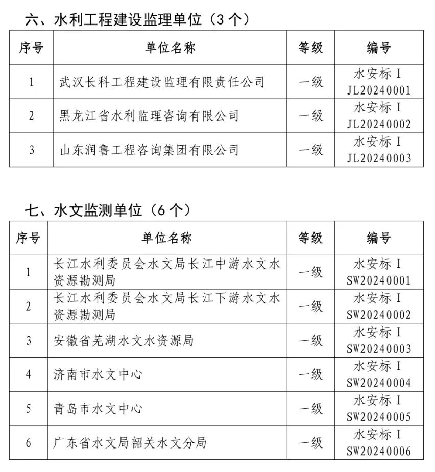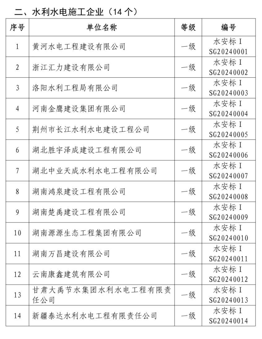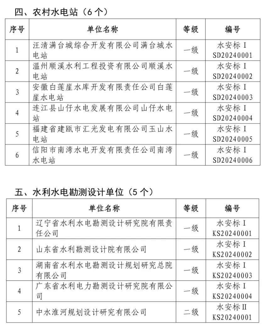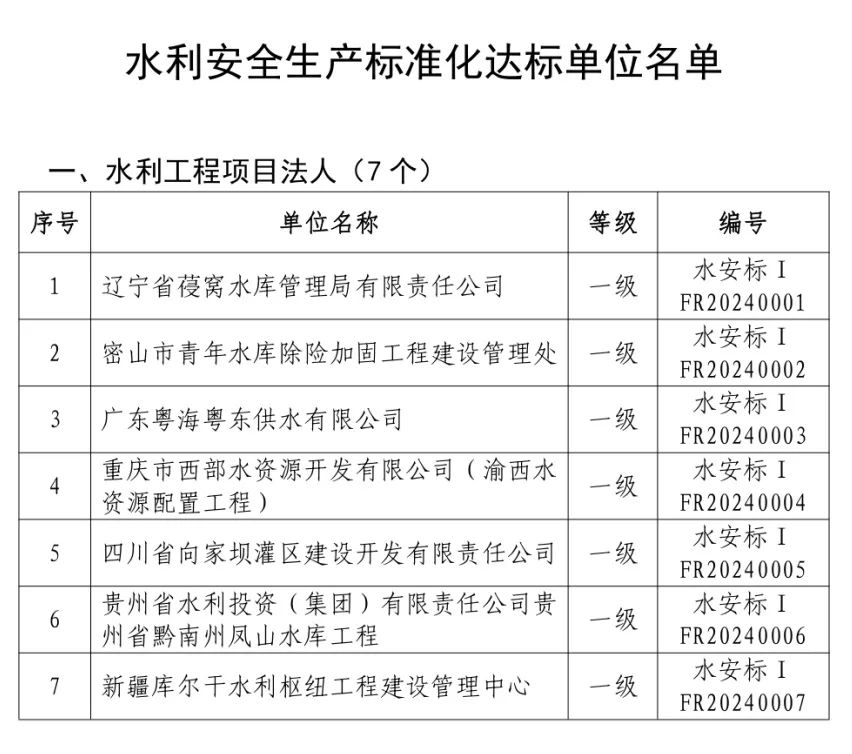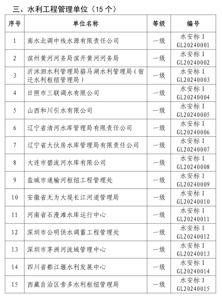 中新网1月22日电 据中国水利官方微信消息,根据《水利部关于印发〈水利安全生产标准化评审管理暂行办法〉的通知》《水利部关于印发农村水电站安全生产标准化达标评级实施办法(暂行)的通知》《水利部办公厅关于印发〈水利安全生产标准化评审管理暂行办法实施细则〉的通知》《水利部关于水利部安全生产标准化评审有关事项的通知》和《水利部办公厅关于水利水电勘测设计等四类单位安全生产标准化有关工作的通知》,经评审,辽宁省葠窝水库管理局有限责任公司等57个单位为安全生产标准化一级单位、中水淮河规划设计研究有限公司等2个单位为安全生产标准化二级单位,名单如下。