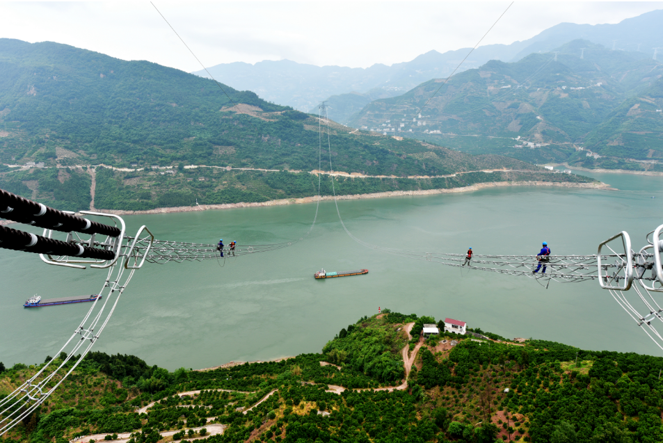 ▲国网湖北电力员工走线验收±800千伏白江线湖北段跨长江输电线路。图/邹小民