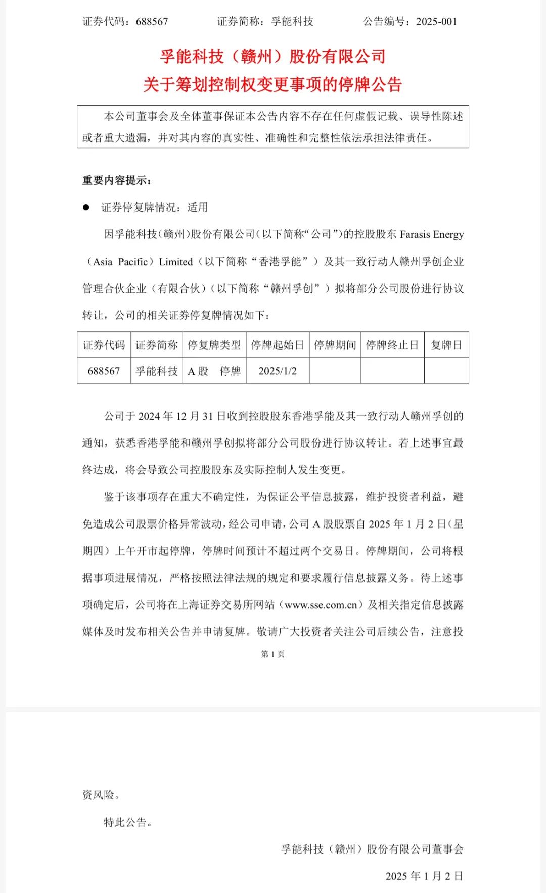 2025年1月1日,孚能科技公告称,公司控股股东香港孚能及其一致行动人赣州孚创拟将部分公司股份进行协议转让。若上述事宜最终达成,将会导致公司控股股东及实际控制人发生变更。