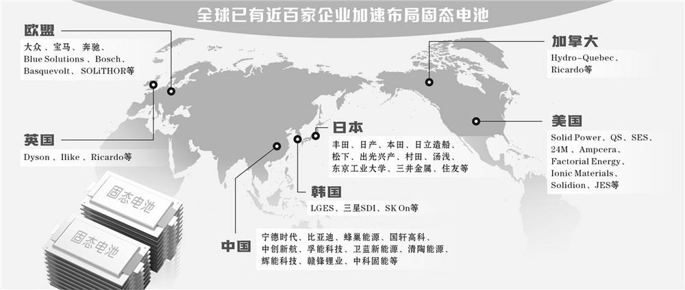 记者根据已公开的企业布局情况梳理发现,目前,全球固态电池产业链已初具雏形。如当升科技、厦钨新能等公司已布局固态电池正极材料领域,赣锋锂业、道氏科技已布局电解质、负极材料等,星源材质已布局隔膜领域,华为、富士康已布局电解质领域,宁德时代、比亚迪、亿纬锂能等涉及整装固态电池,红豆股份等则涉足固态电池的智能制造,海目星发力固态电池设备制造、电池销售等。整体而言,入局固态电池者涉足整个产业链一个或多个环节。