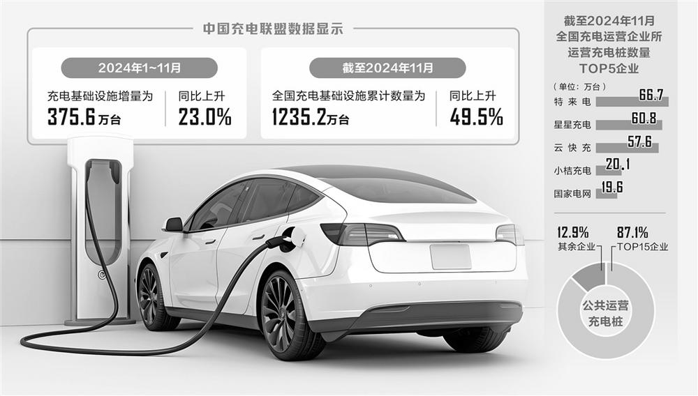 中国充电联盟数据显示,2024年1~11月,充电基础设施增量为375.6万台,同比上升23.0%。其中公共充电桩增量为73.4万台,同比下降11.3%,随车配建私人充电桩增量为302.2万台,同比上升35.7%。截至2024年11月,全国充电基础设施累计数量为1235.2万台,同比上升49.5%。