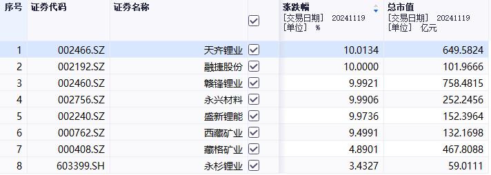 锂矿股也跟随联动,天齐锂业、融捷股份、赣锋锂业等多股涨停,西藏矿业、藏格矿业等跟涨。