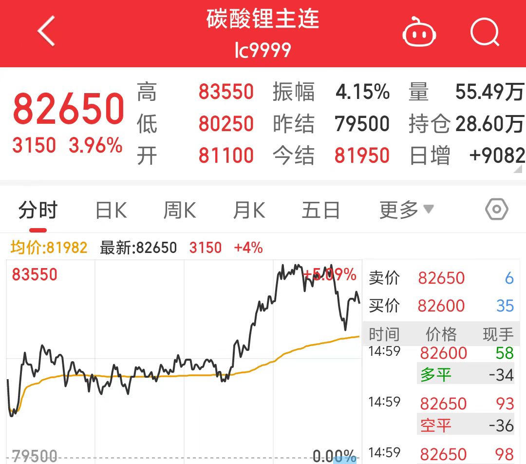 11月19日,碳酸锂主力合约高开约2%,午后盘中拉升涨超5%,收涨3.96%。