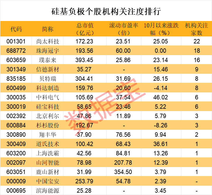 从机构关注度来看,尚太科技、珠海冠宇、璞泰来的关注度较高,均有10家以上机构评级。此外,多只个股10月以来接受了机构调研,透露硅基负极的布局进展。