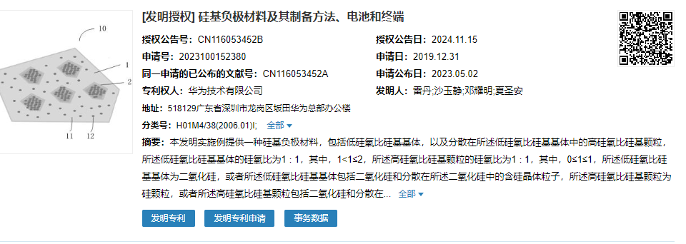 11月15日,国家知识产权局披露,华为公开了硅基负极材料的专利,名称为《硅基负极材料及其制备方法、电池和终端》。该专利主要解决了硅基材料因膨胀效应过大导致电池循环性能低的问题,提高负极的循环稳定性。