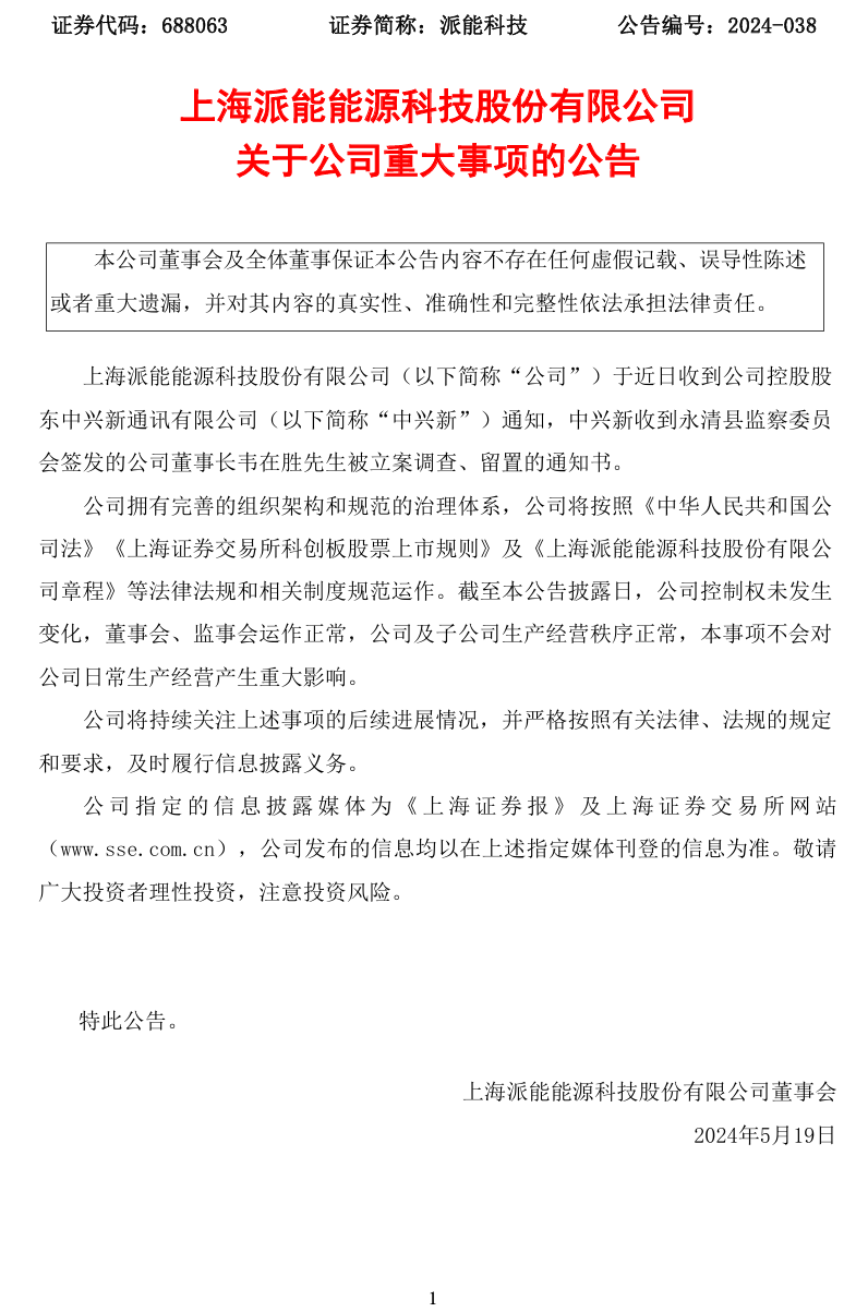 5月19日,科创板储能“新贵”派能科技发布公告,近日收到公司控股股东中兴新通讯有限公司(以下简称“中兴新”)通知,中兴新收到永清县监察委员会签发的公司董事长韦在胜被立案调查、留置的通知书。