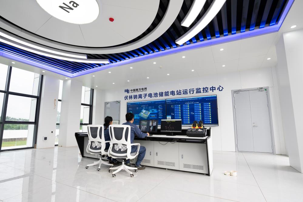 在伏林钠离子电池储能电站主控楼里,技术人员通过电子大屏实时监控储能电站设备。(南方电网广西电网公司供图)