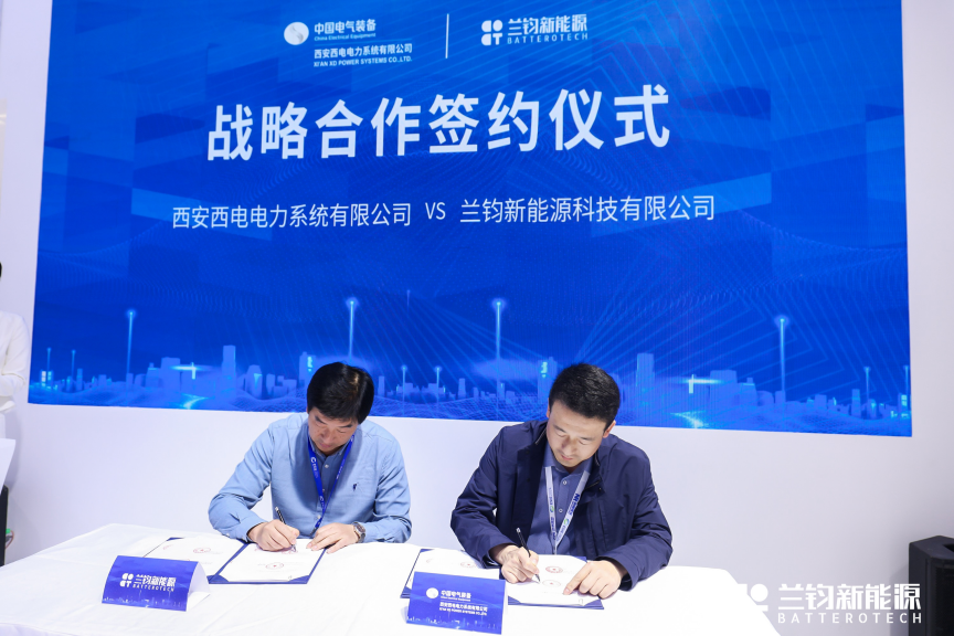 兰钧新能源储能集成事业部副总经理刘江晖、西电电力系统开发总监彭程分别代表双方公司签字。未来,兰钧新能源与西电电力系统将持续发挥各自优势,形成资源协同,共同推进重点项目落地。
