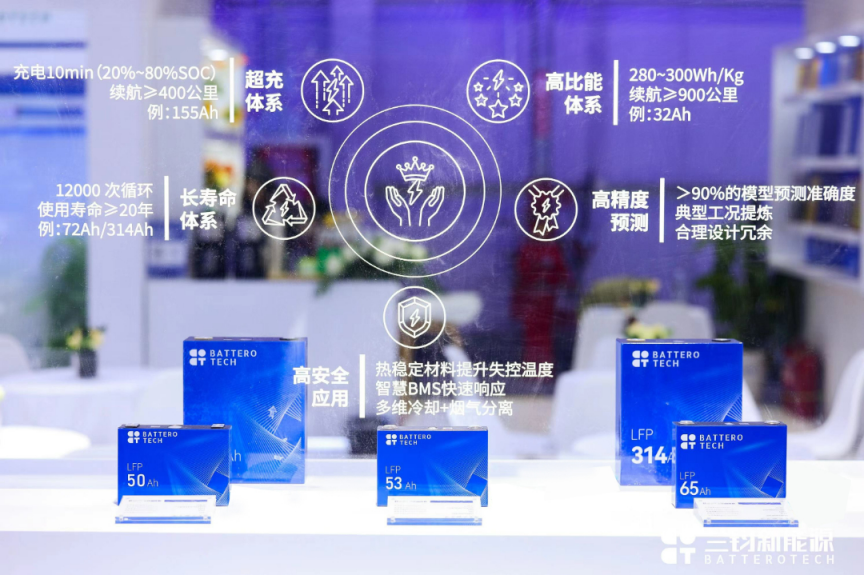 本次展会上,兰钧新能源携新一代升级版314Ah长寿命储能电芯、家庭储能、工商业储能、电力储能等全系列储能产品解决方案实力亮相展会。据悉,经过持续优化升级,兰钧新能源新一代314Ah储能电芯在性能方面得到了进一步提升,循环寿命可达12000次以上,经典使用工况下首年衰减≤3%,-30℃放电容量保持率90%以上,存储寿命≥20年@80%EOL。