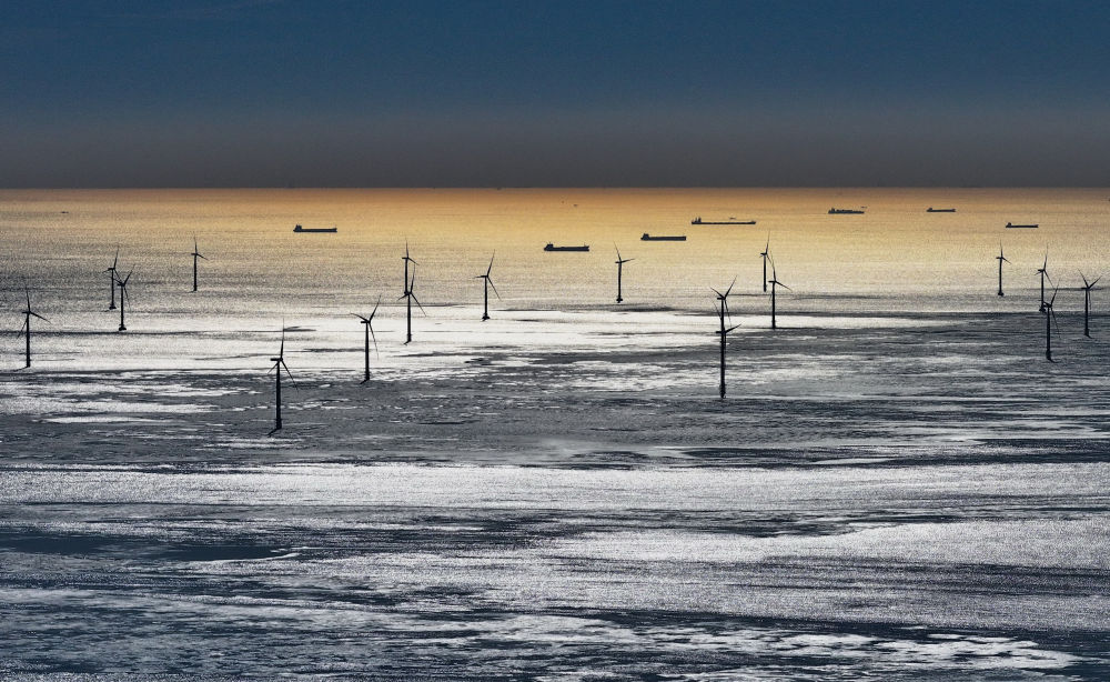 这是2023年12月22日拍摄的河北省唐山市海港经济开发区辖区内的海上风电场(无人机照片)。