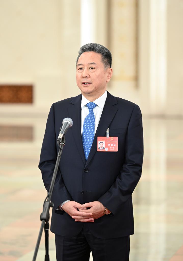 3月8日,第十四届全国人民代表大会第二次会议第二场“部长通道”集中采访活动在北京人民大会堂举行。这是交通运输部部长李小鹏接受媒体采访。新华社记者 牟宇 摄